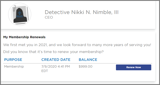 Figure 1. Example that shows a customized renewal message that you can place on the call-to-action card of the member's Personal Snapshot page.