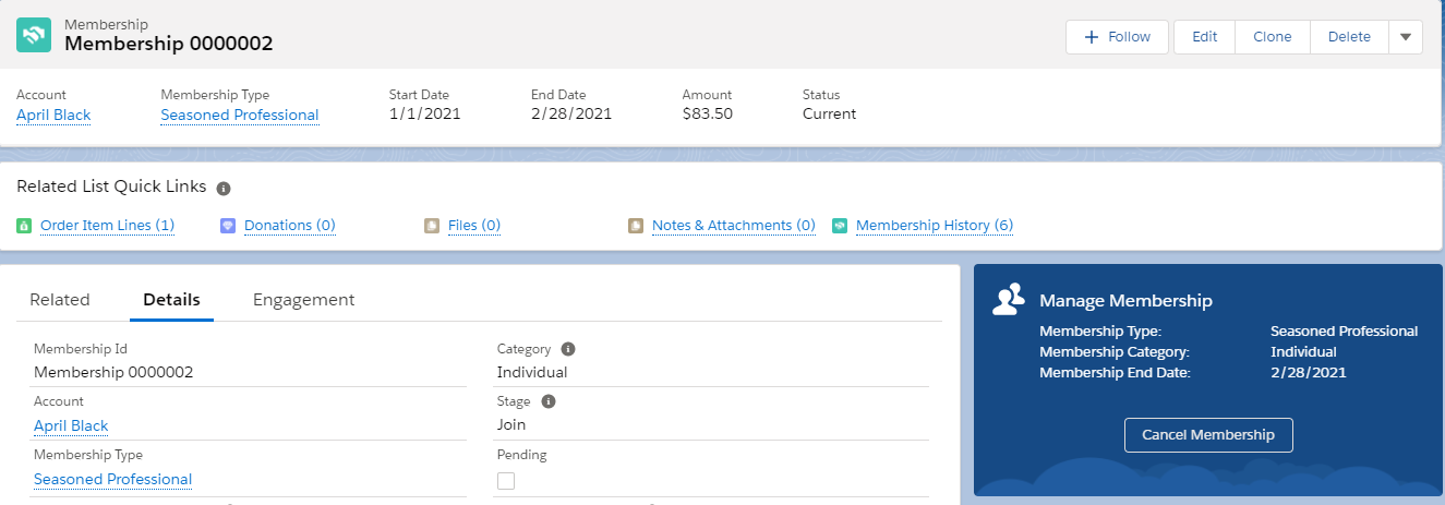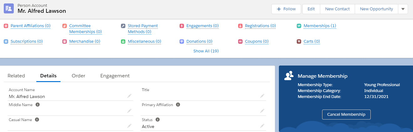 To use Cancel Membership Mid-Term feature, add the Manage Membership LWC on the Account page. You can add this LWC to the section on the right or any other section of the page.