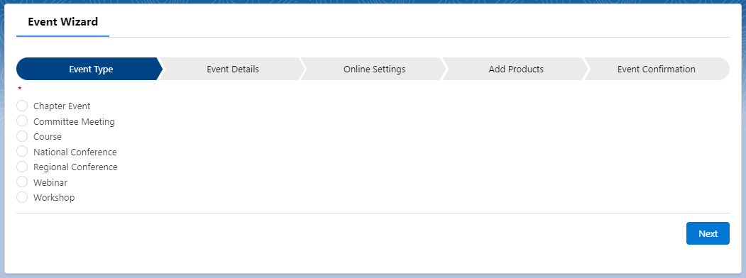- Begin using the Event Setup Wizard feature by choosing your Event Type.