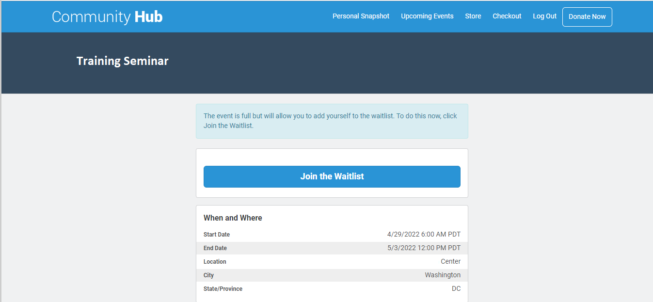 Figure 1. Event Waitlisting in Community Hub that shows the type of information members will see