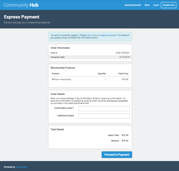 If constituents are not logged into Community Hub, a message displays at the top of the page prompting them to log in or create an account. Constituents can log in to use their stored payment options or they can choose not to log in, and their payment is connected to the Online Guest Checkout account.
