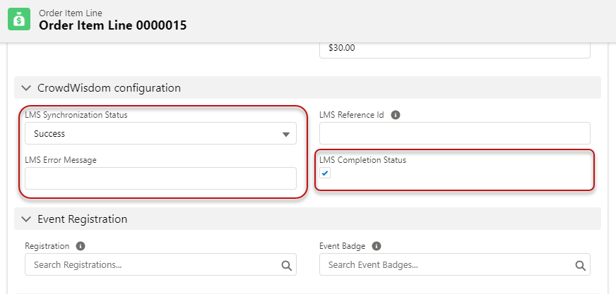 Once the learner completes a course in Crowd Wisdom, the course completion is tracked within the corresponding Order Item Line in Nimble AMS. If there are any errors during the data write-back process, the error details are captured within the corresponding Order Item Line.