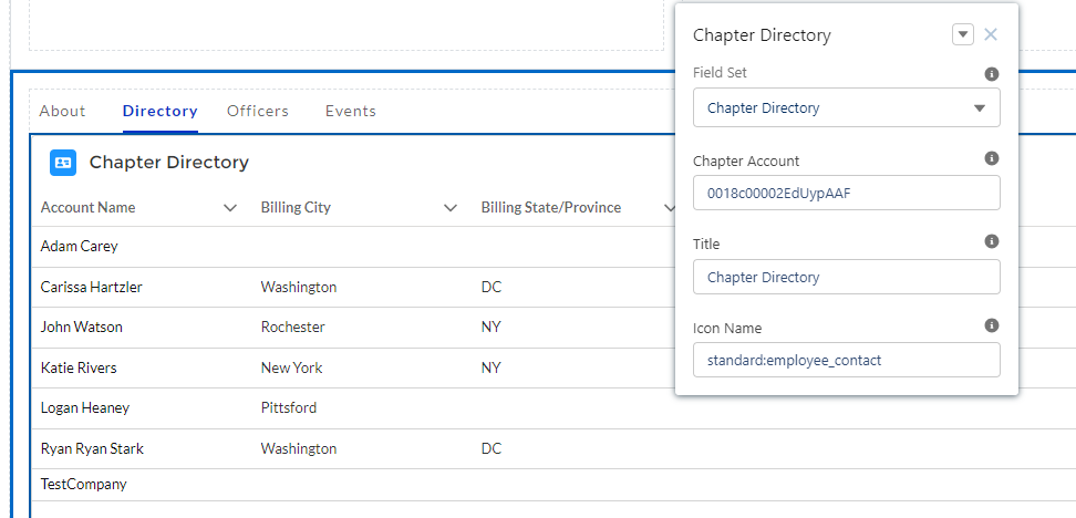 The Chapter Directory Lightning Web Component (LWC) is a component that displays a list of members of the specifed chapter. It can be configured to use a specific chapter ID, or to display dynamically based on a URL parameter.