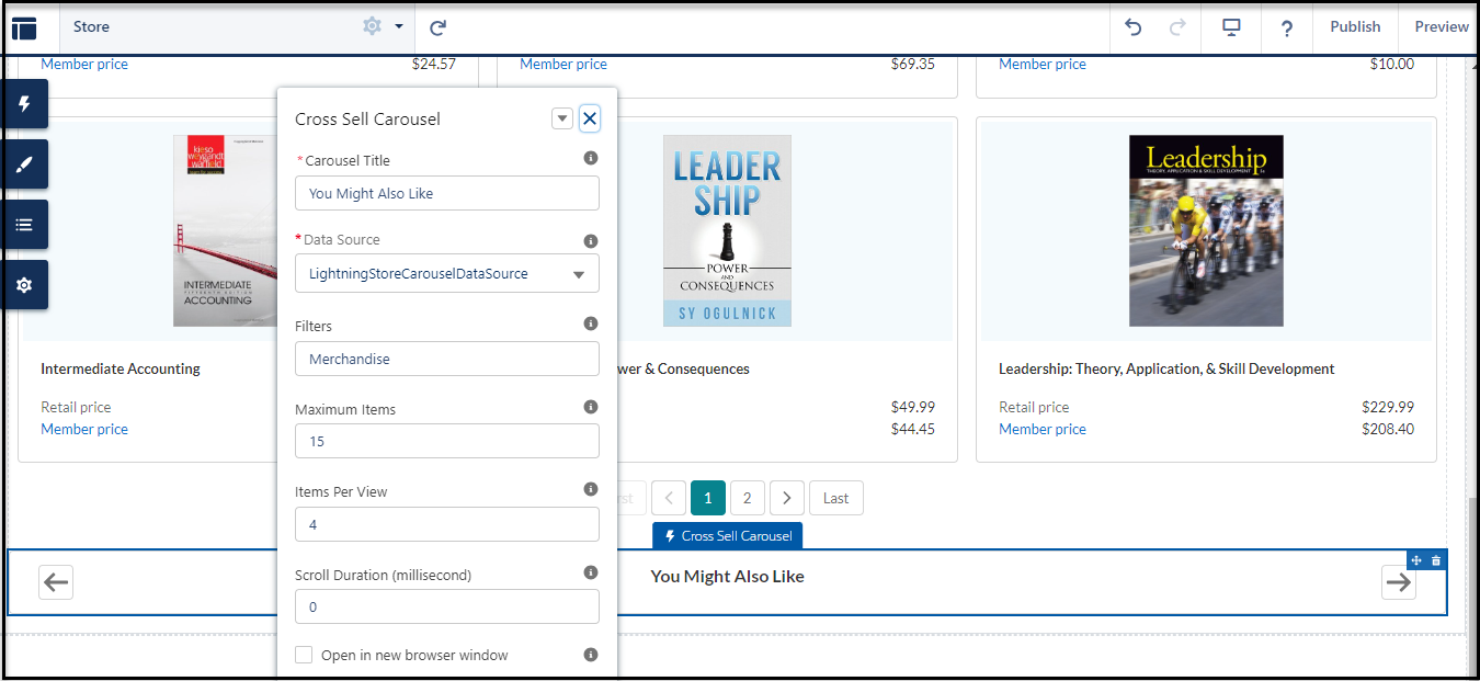 On the page, click within the Cross Sell Carousel component to bring up the Property editor.