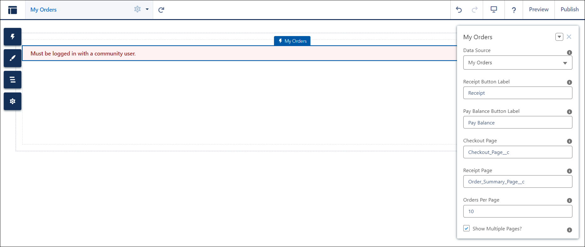 My Orders Lightning Web Component (LWC) displays a list of Orders once placed on the Experience Cloud Lightning page. My Orders LWC is powered by the Data Source API that lets the Admins plug the purpose-built data sources if required.