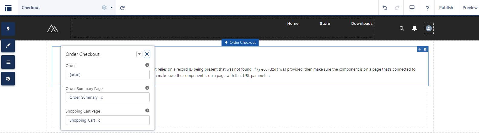 | Order | This setting needs to be configured to display the details of the order for checkout. Use {recordId} for the current record, {url.<param>} (e.g. {url.id}) for a URL parameter, or a Salesforce record ID. |