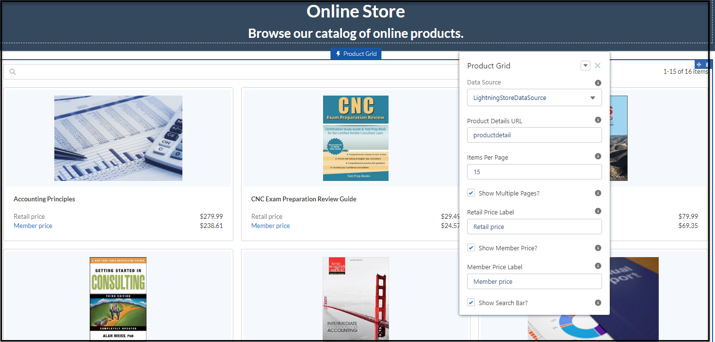| Data Source | Shipped with a default Data Source "Lightning Store Data Source", the product grid is ready out-of-the-box to display active, enabled merchandise products. Additional Data Sources can be created and configured to allow for flexibility in your Community. |