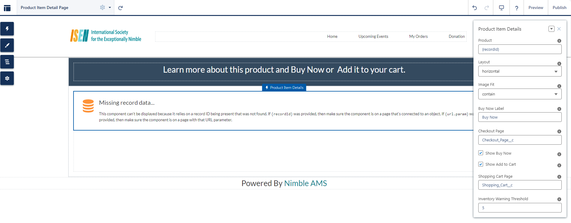 On the page, click on the Product Item Details component to bring up the Property editor.
