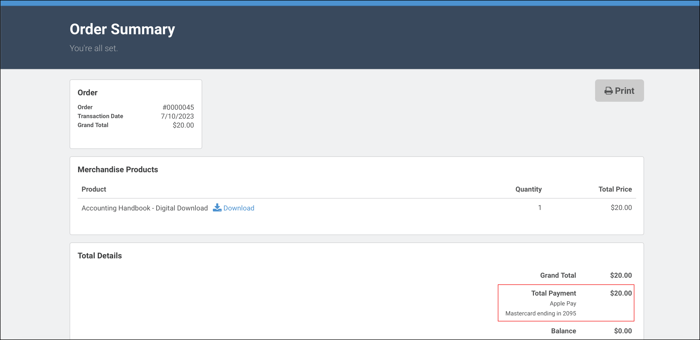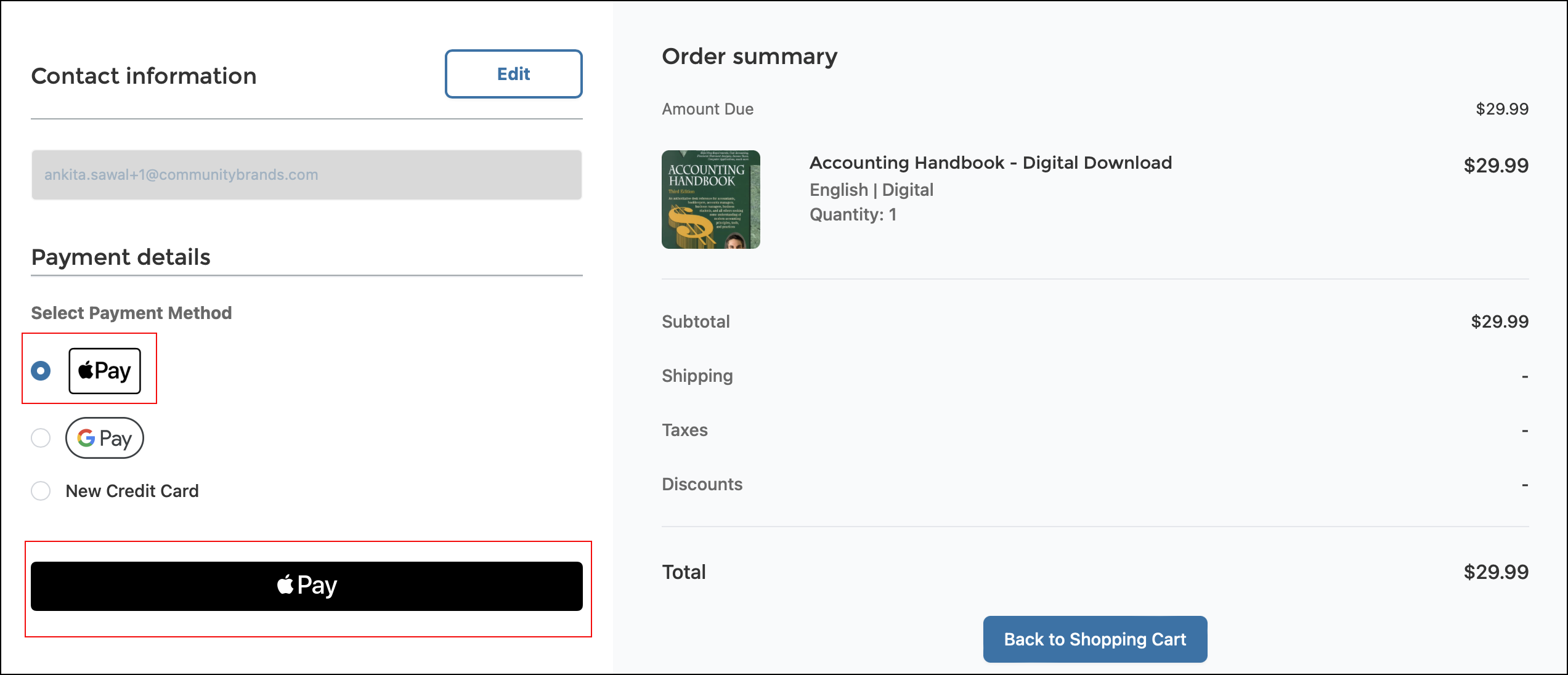Let's say there is a member who wants to buy the Accounting Handbook - Digital Download from the online store. The Buy Now button will take them straight to the Experience Cloud Checkout page where they can view their order details and pay through the Apple Pay option. After successfully completing the purchase process, a detailed Order summary page will be displayed.