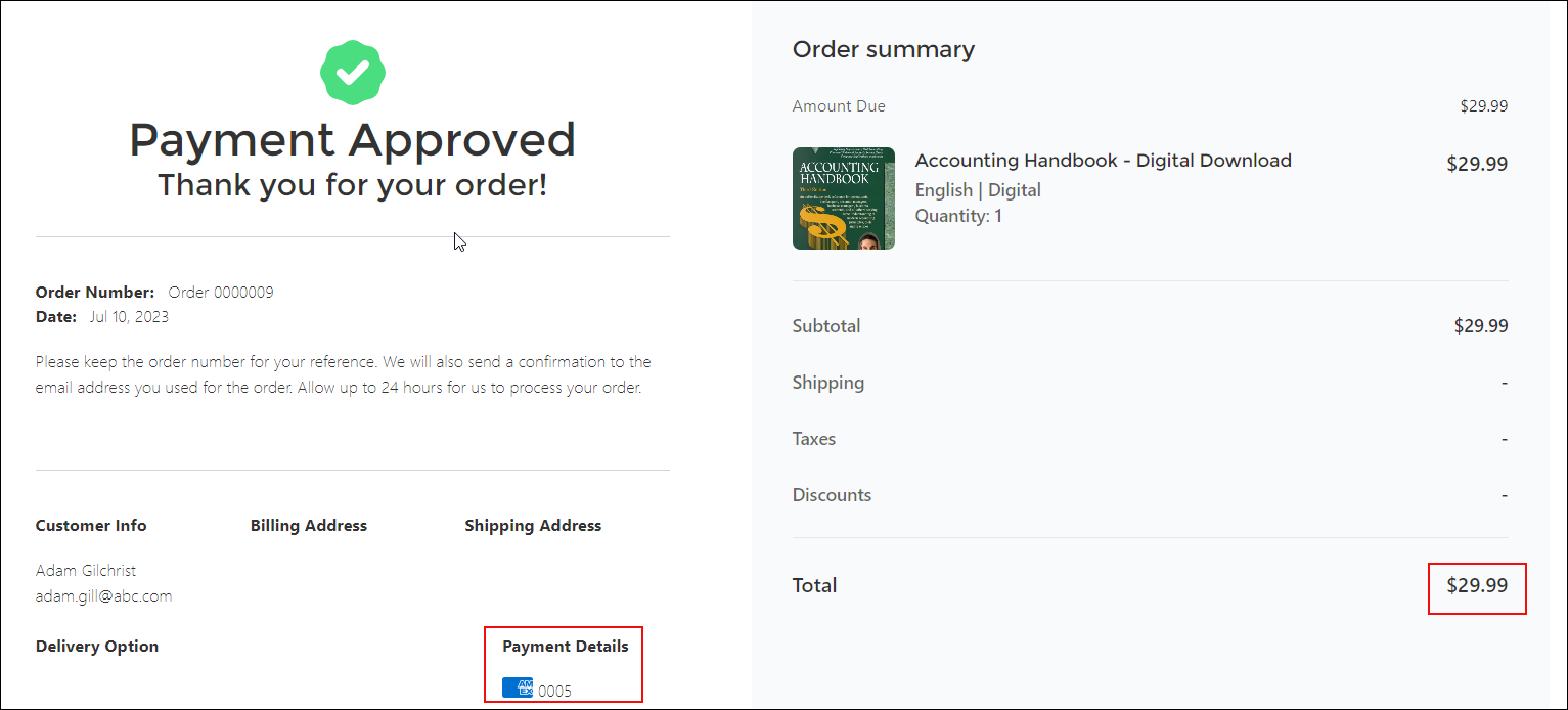 Upon completion of the purchase process, an order will be created, and an Order Summary page will be generated.
