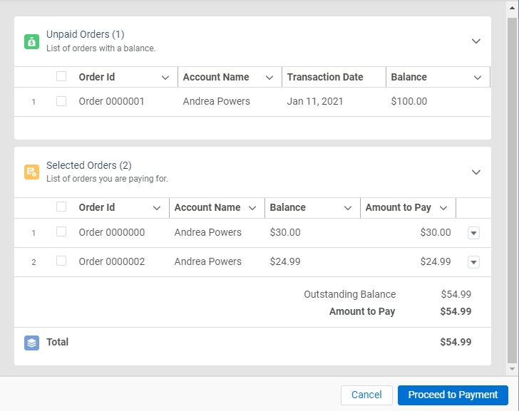 Users are able to apply a single payment to multiple outstanding orders, through a guided process which is accessible to users via Community Hub. Users can simply follow an easy process to view all orders with a balance in a single window, then select one or multiple orders to make a single payment.
