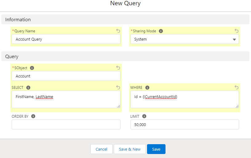NC.SOQLDataSource. - In Context, enter the Query Name of the query created before.