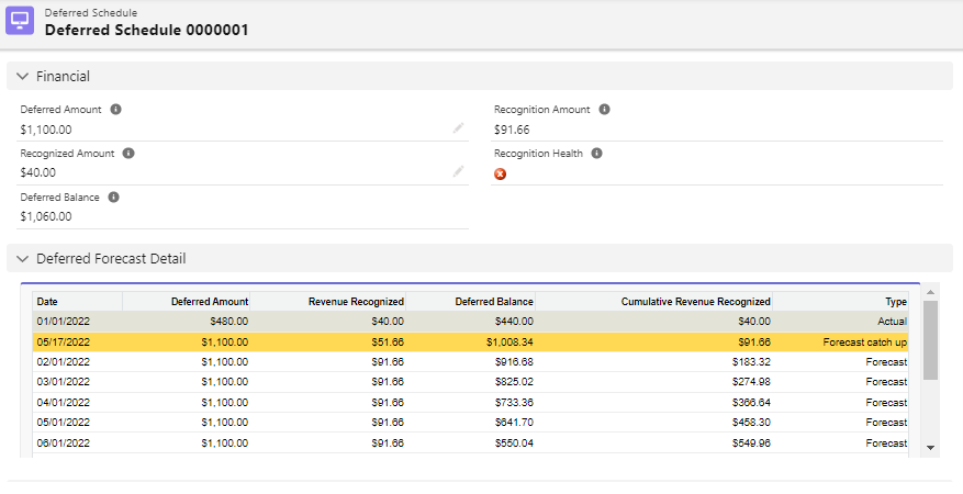 Previously there was no column for forecast type in deferred schedule. If membership was cancelled by mid-year, then it did not recognize the revenue for the rest of the duration. To resolve this issue, we have added the Type column with fields which are Actual, Forecast Catchup and Forecast. If there is a Forecast Catchup row then it will be highlighted. In terms of transactions, it provides the appropriate deferred revenue forecast. (AMS-12595)