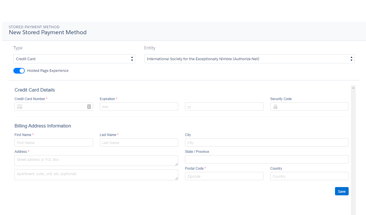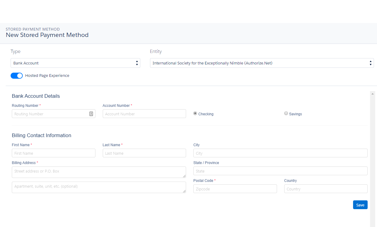 With Hosted Payment Forms, Staff Users in Nimble AMS and Constituents in Community Hub enter Bank Account or Credit/Debit Card details on the BluePay hosted payment pages to process electronic payments.