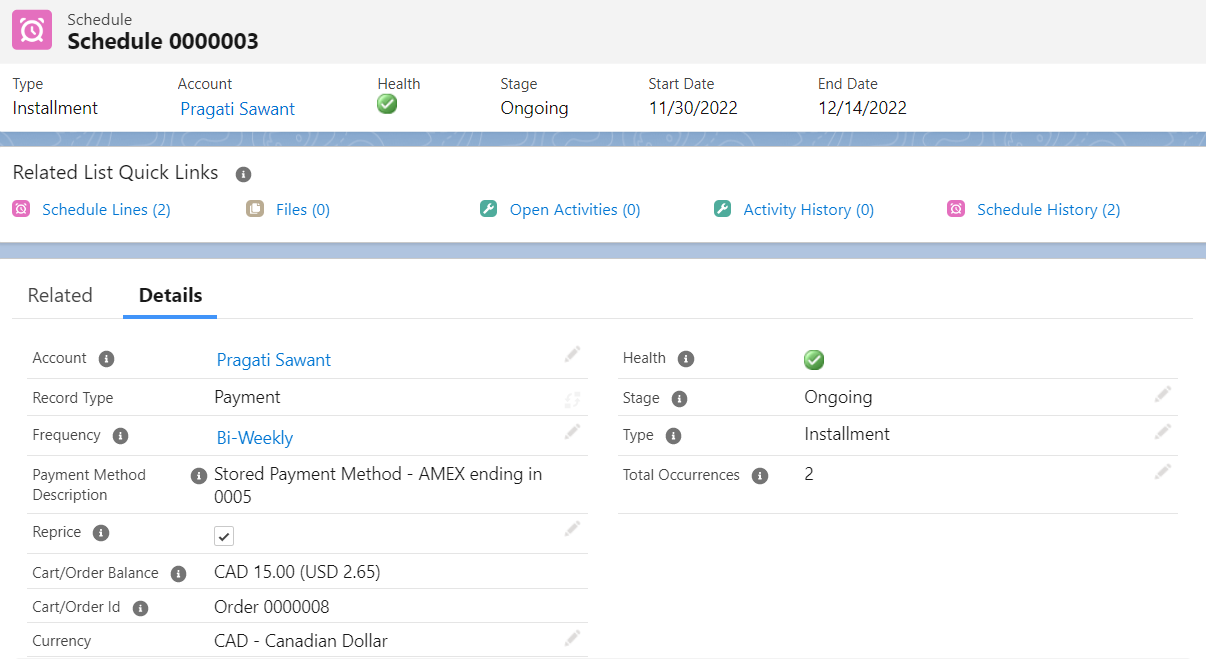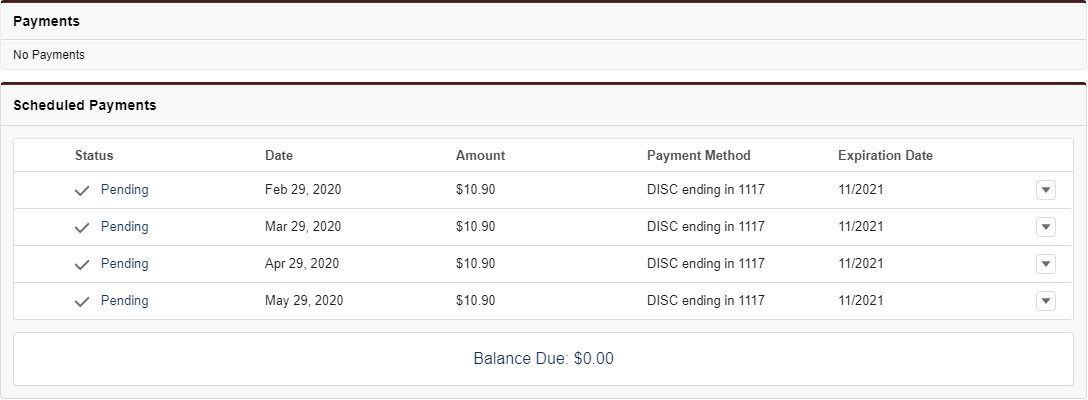 As an example, if there is an order with a total amount of $43.6 and it is scheduled with 4 installments of amount $10.90 each, then 4 schedule lines get created. If the staff user pays off $25 on the constituent's behalf, then the first two schedule lines get canceled and the third schedule line's amount gets adjusted to $7.70.