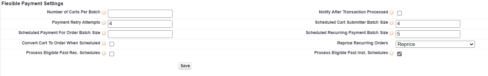 - Under Flexible Payment Settings, check the box for Process Eligible Past Date Inst. Schedules.